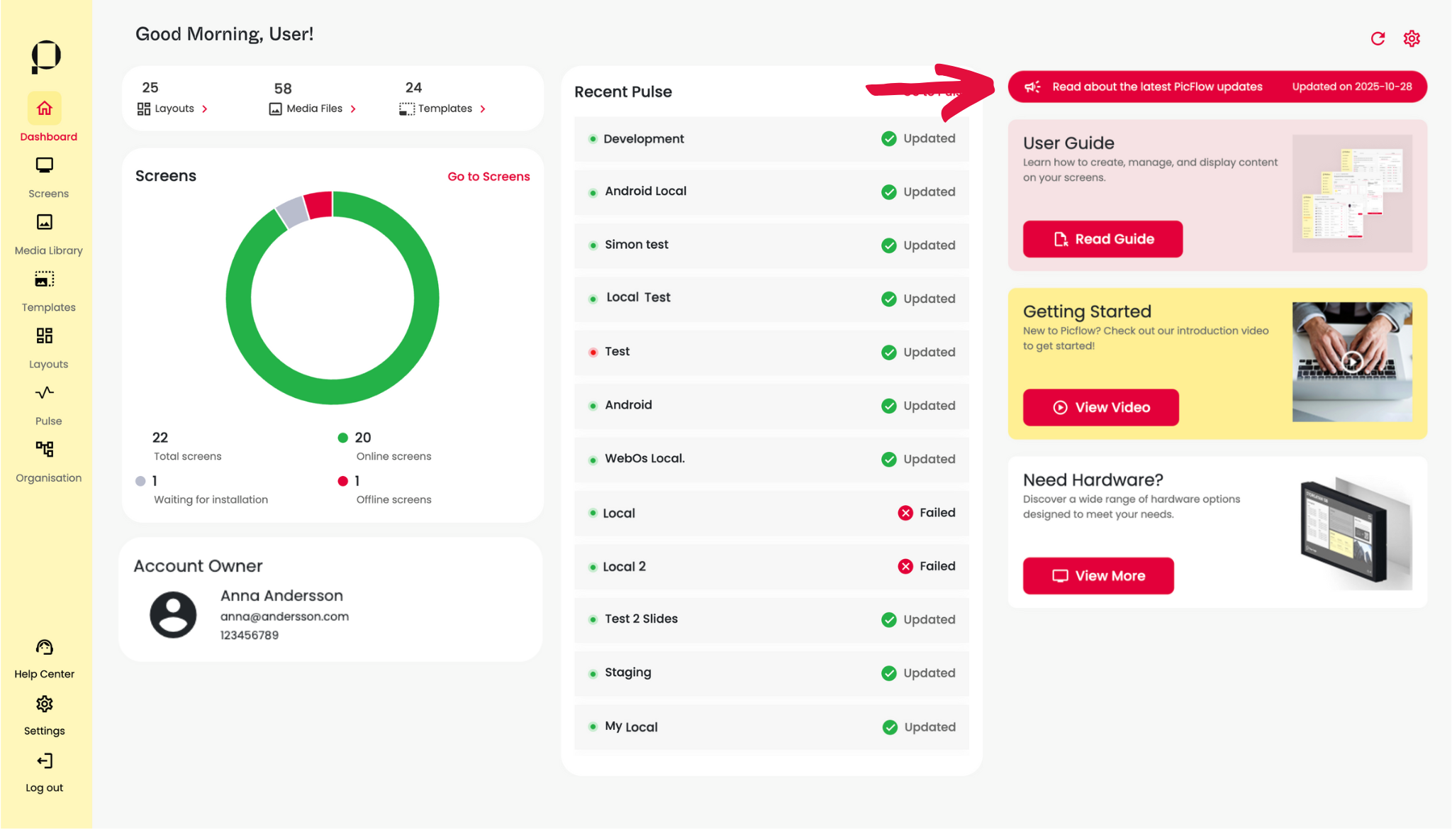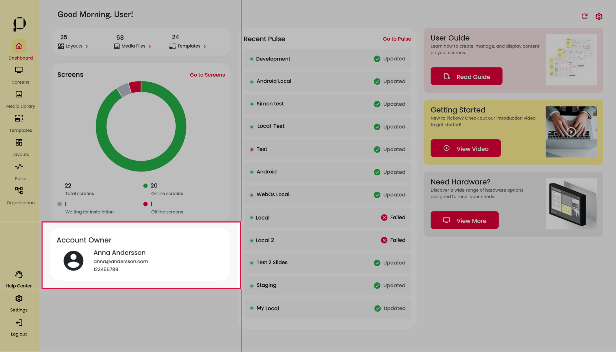 Widgeten Account Owner visar din organisations kontoägare, alltså den person med ytterst ansvar internt för organisationen i PicFlow. Kontaktuppgifterna till angiven Account Owner är synliga för alla användare i organisation på varje användares dashboard.