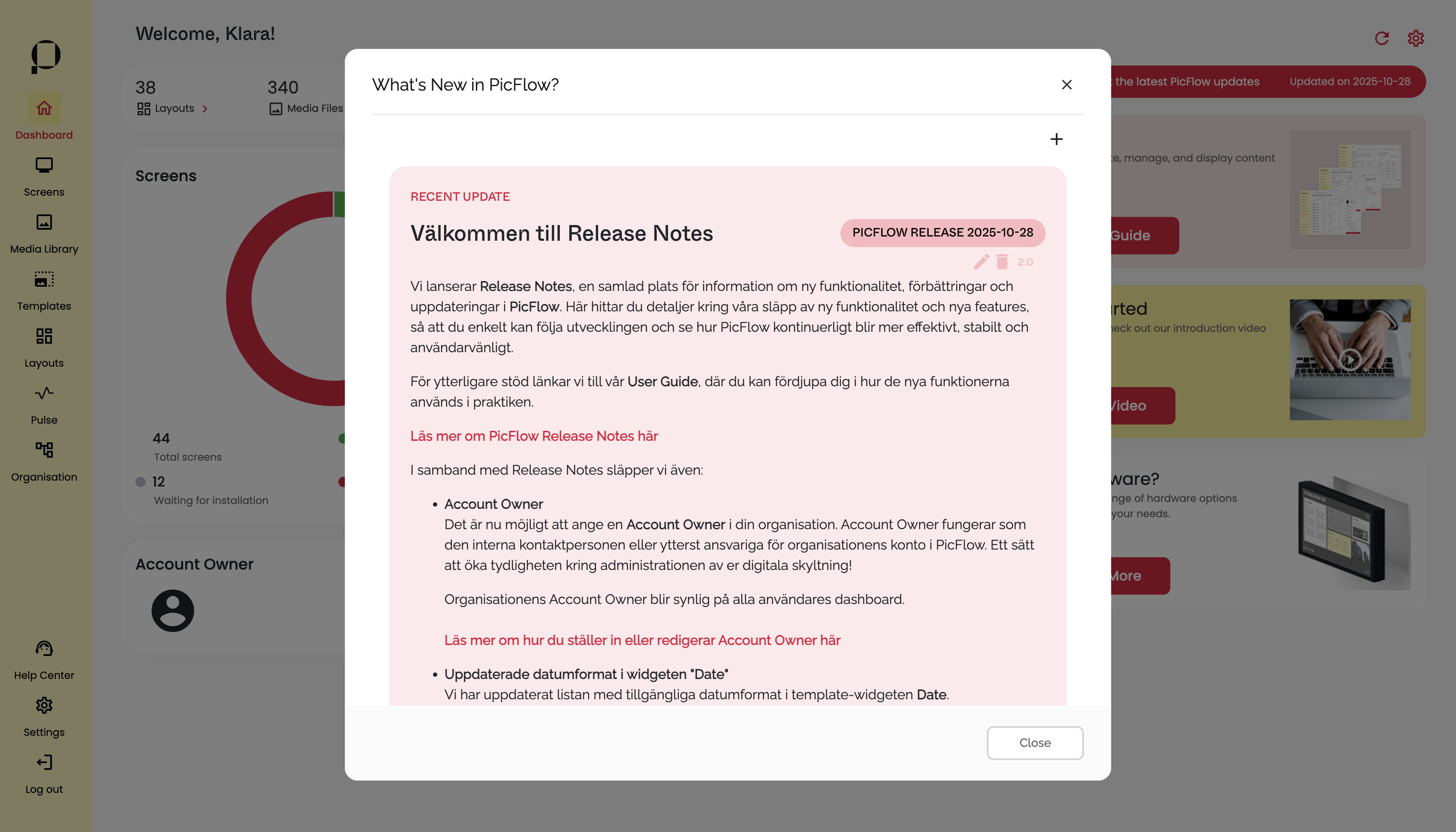 Klicka på bannern för att öppna ett pop up-fönster som innehåller Release Note-flödet.