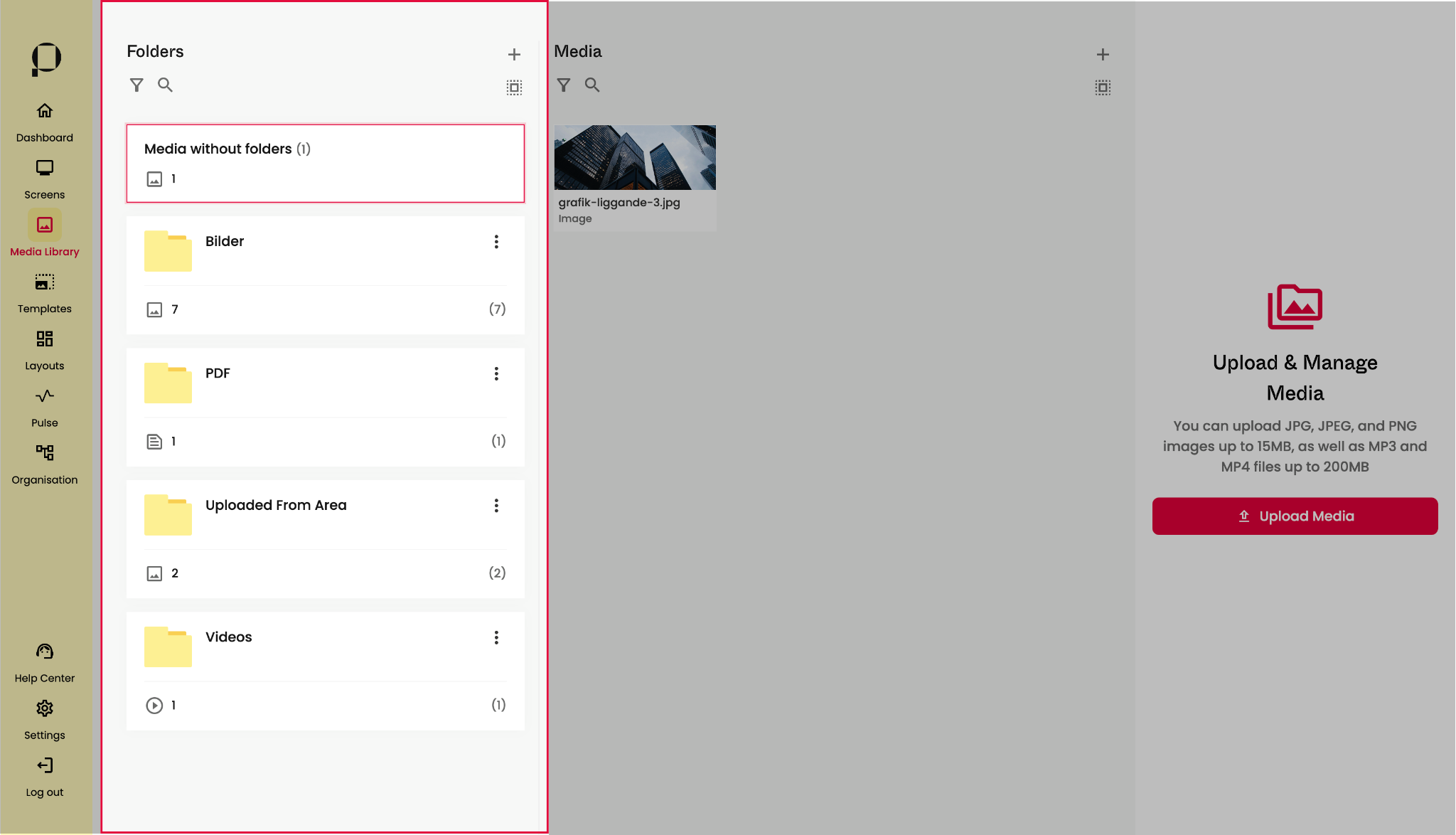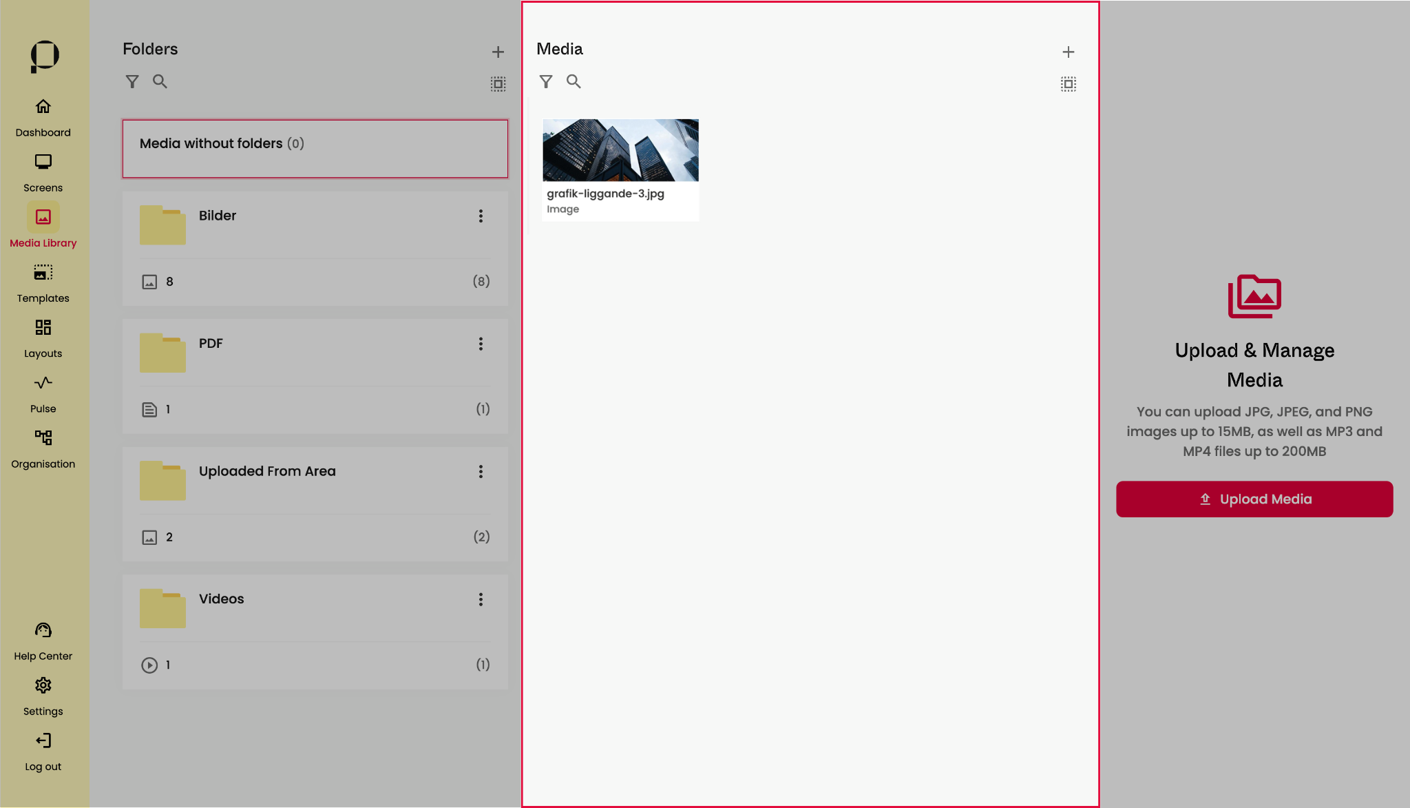 Vilka filer som visas beror på vilken mapp som är markerad i “Folders”-sektionen på skärmens vänstra sida. I detta exempel är standardmappen “Media without folders” vald under “Folders”, och ett bildobjekt visas därför i “Media”-sektionen.