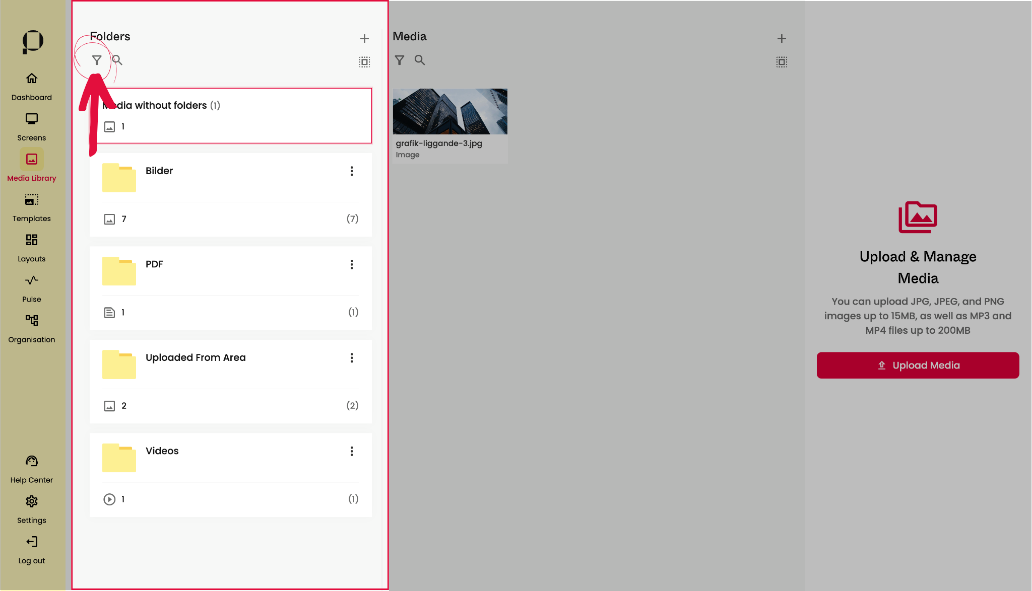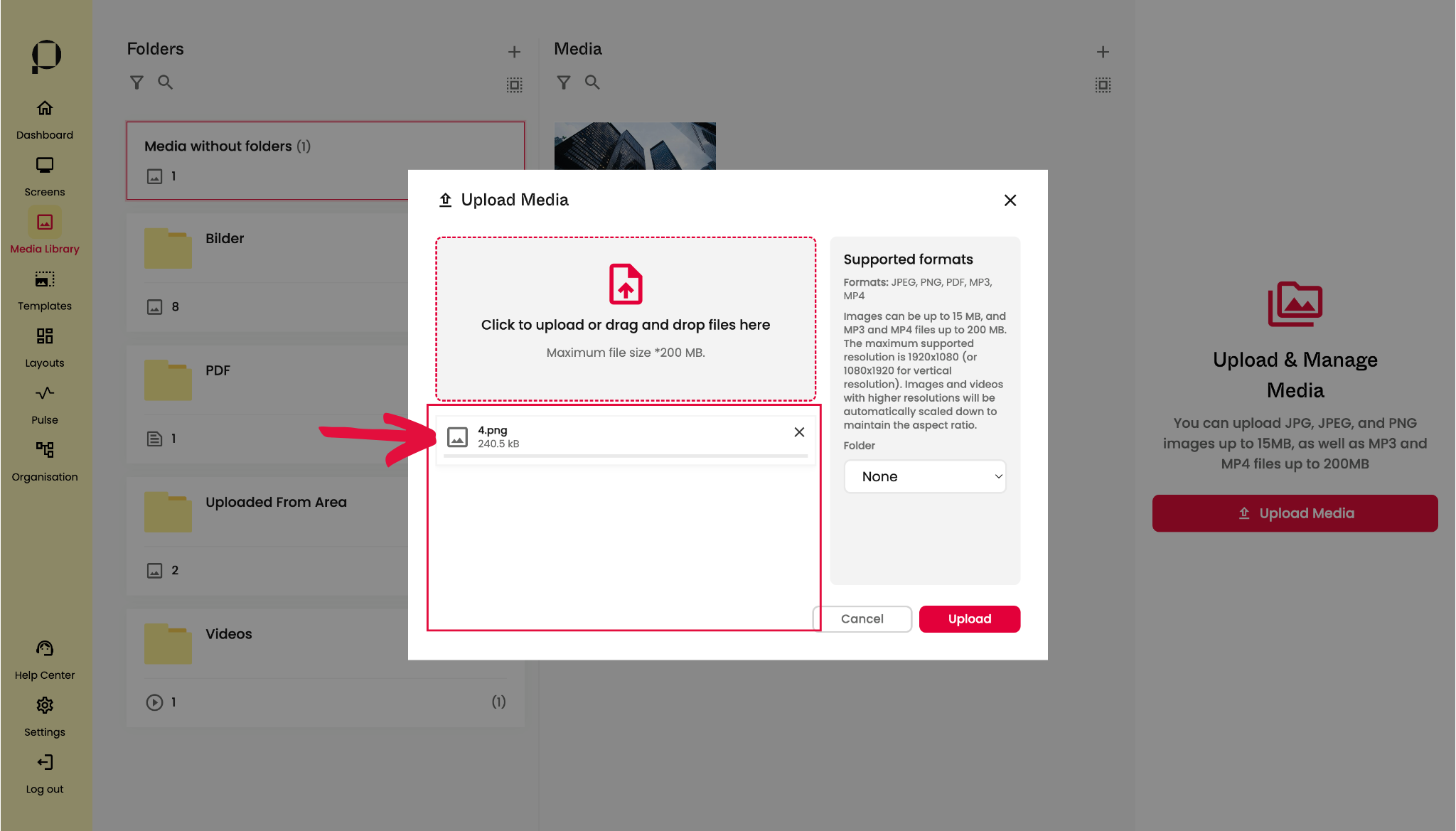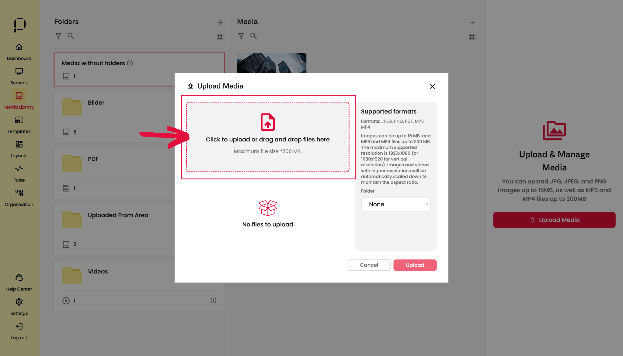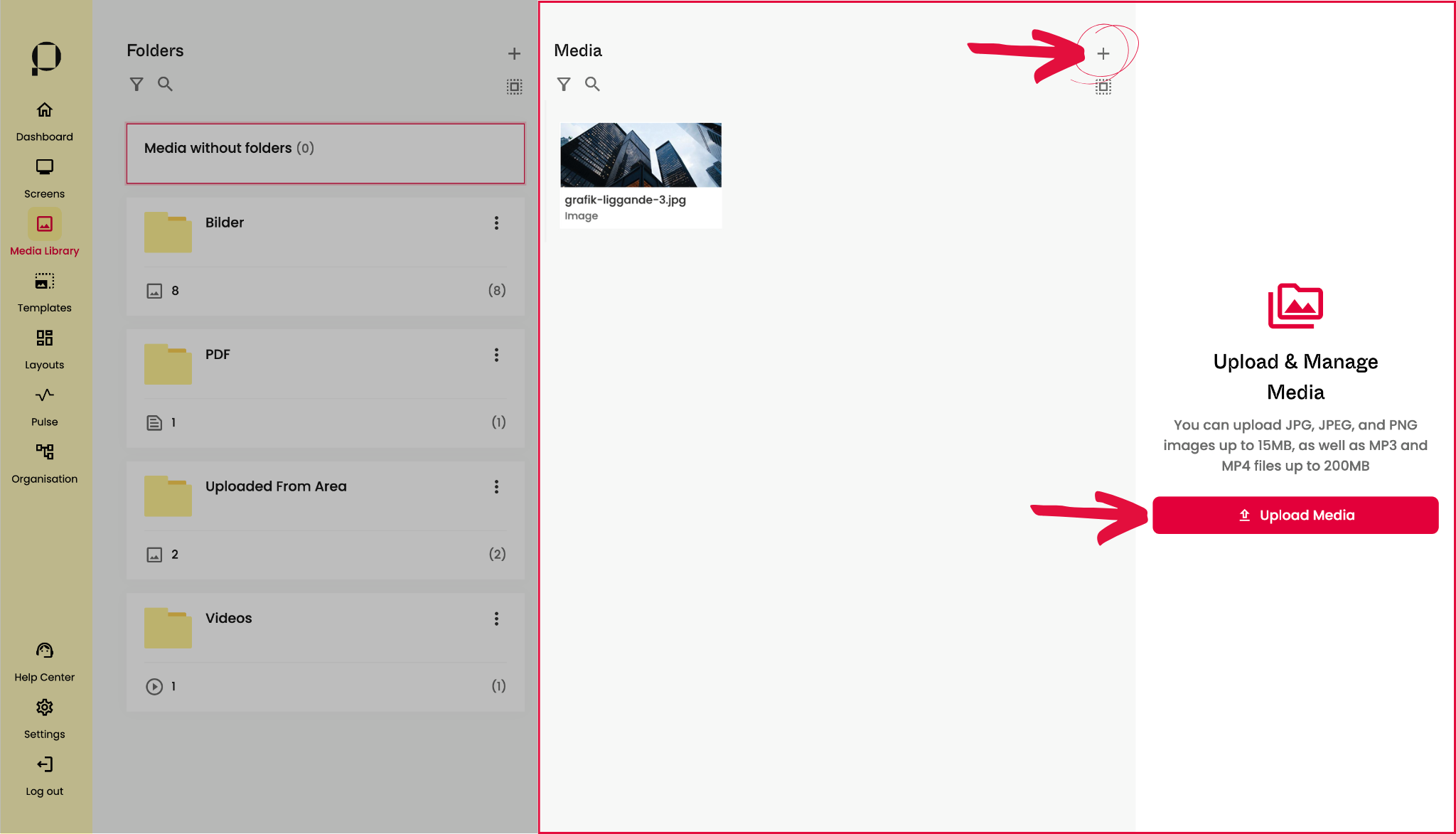 1. Klicka på den stora, röda knappen “Upload Media” som finns i mitten skärmens högra sidebar.