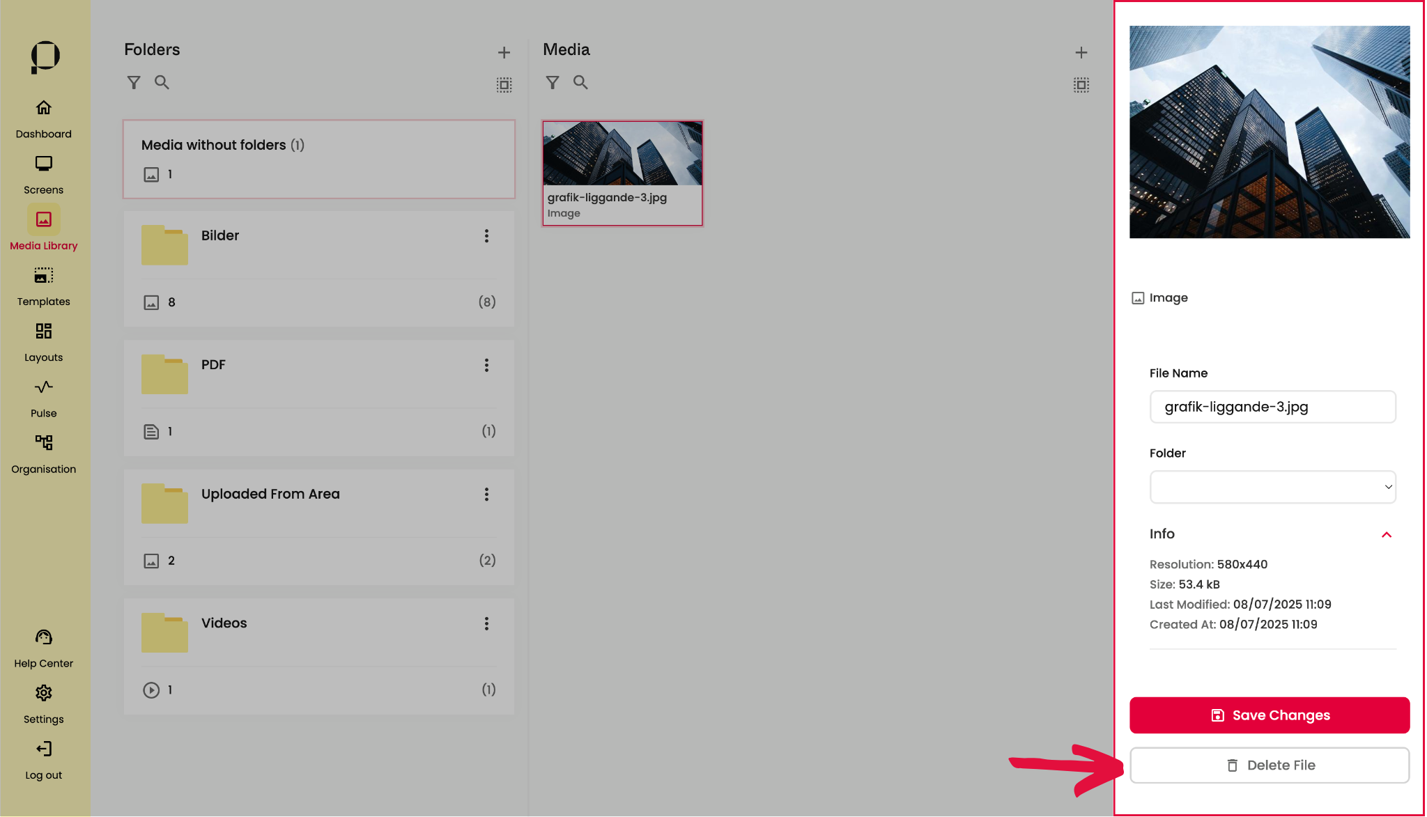 Klicka sedan på knappen “Delete File”  längst ned i den högra sidomenyn.