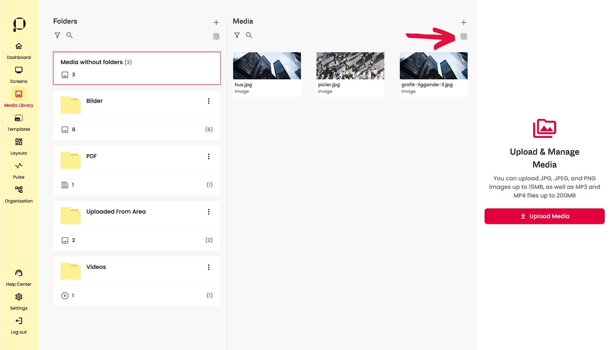 För att radera flera mediefiler, börja med att klicka på symbolen för select (den lilla rutan omringad av en annan streckad ruta), i det övre högra hörnet av “Media”-sektionen.