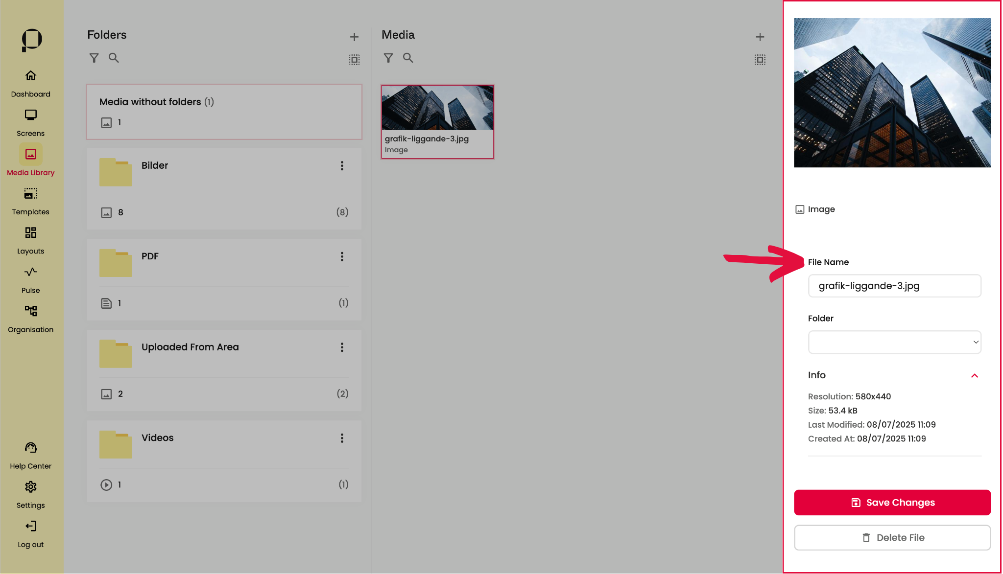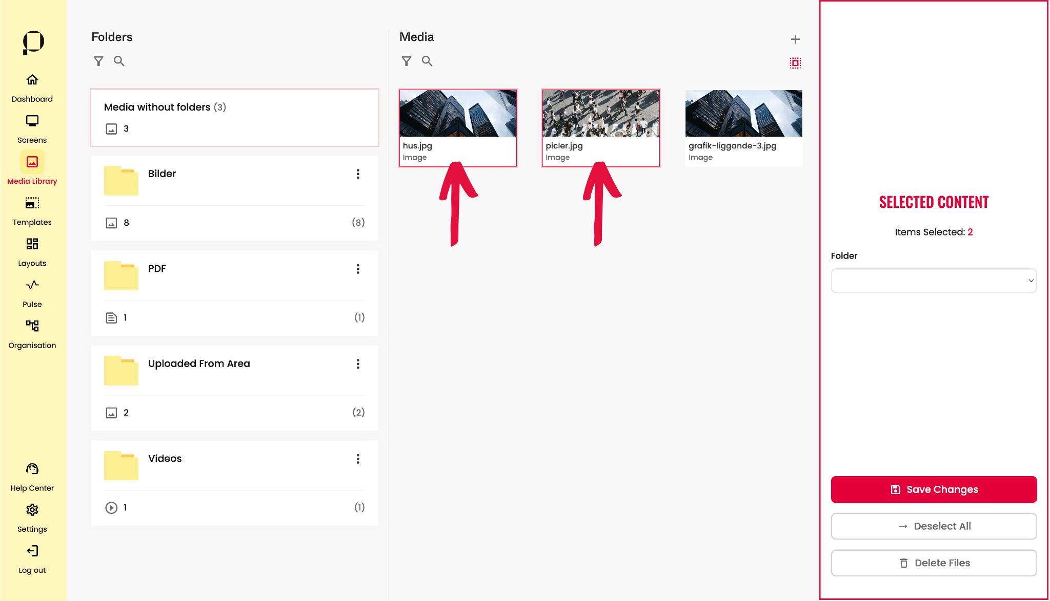 Dina uppladdade filer visas i den högra sektionen “Media”.
