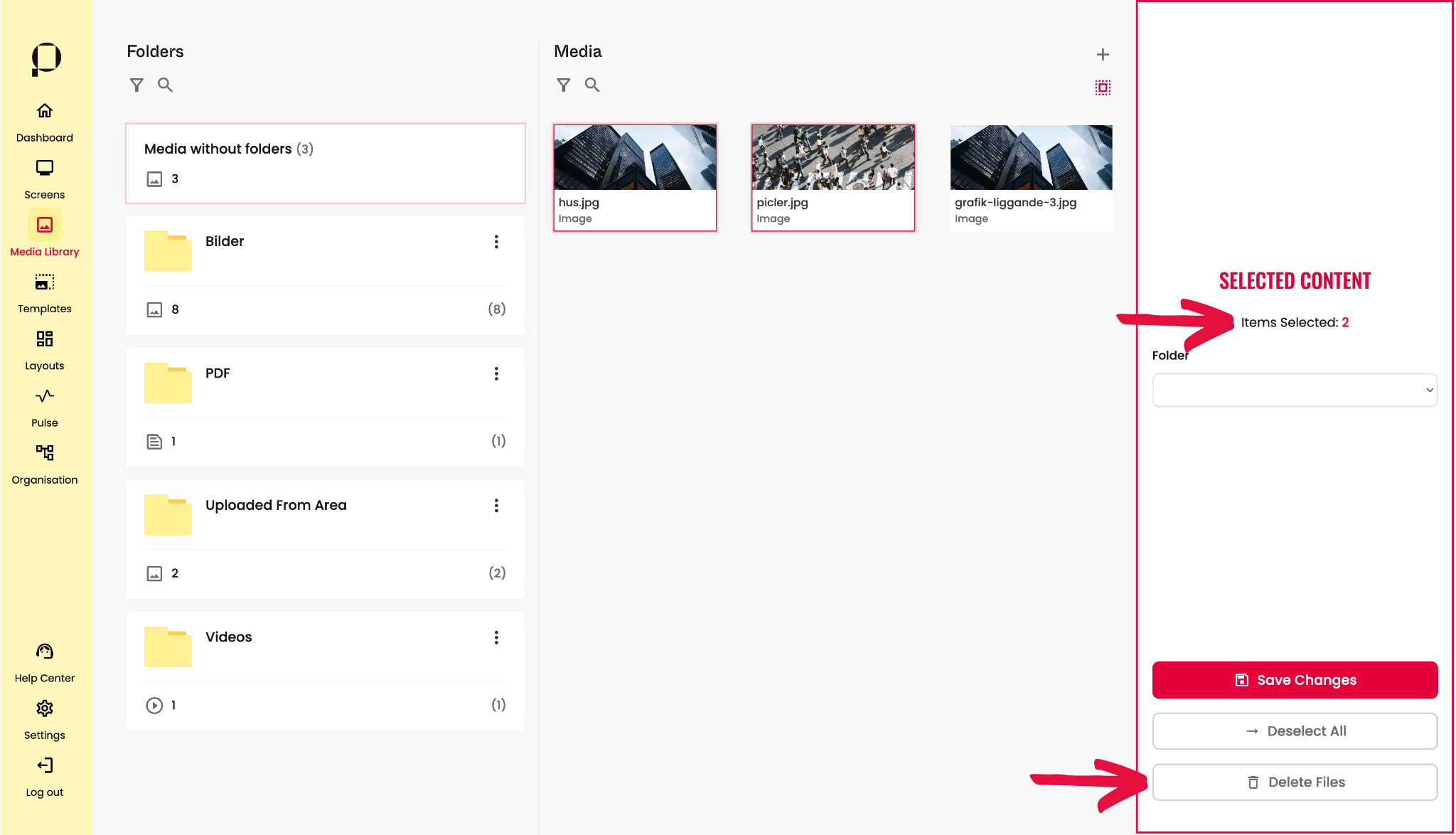I sidopanelen kan du se hur många objekt som är valda. Klicka på “Delete Files” längst ned i sidopanelen för att radera de markerade objekten.
